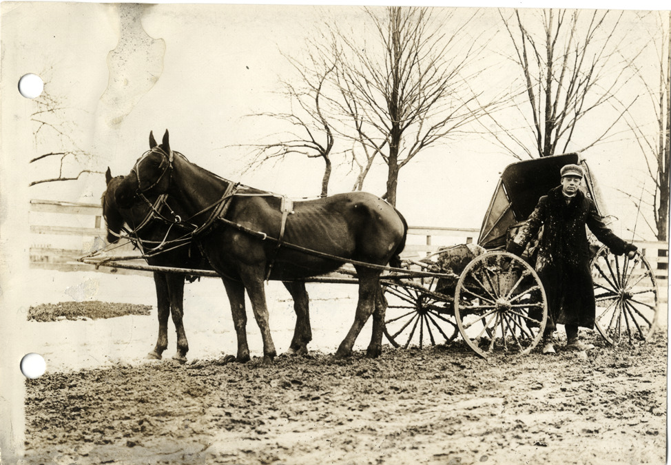 View of a man posing with a horse-drawn carriage on the side of a muddy rural road in Canada. Stamped on back: "Spooner & Wells, Inc., photographers, 1231 Woodward Ave., Detroit, Mich., telephone North 1745." Handwritten on back: "Taken in Canada for Strauss Land Corp'n. Carriages."