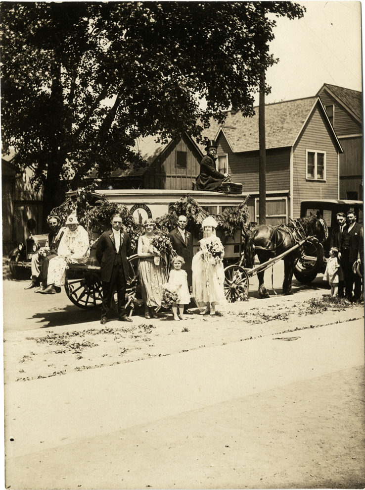 View of a bridal party, including bride, groom, bridesmaid and flower girl, posing in front of a decorated horse-drawn wagon. Two men, dressed as clowns, sit on back of wagon. "Liberty Dairy Co." is painted on side of wagon. Handwritten on back: "Carriages."