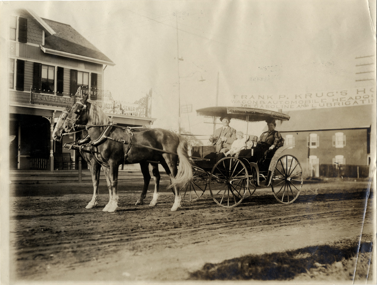 View of a man, woman and child posing in a horse-drawn carriage in Long Island, New York. Frank P. Krug's Hotel in background. Stamped on back: "Photo by F. Ed. Spooner, 1536 B'way, telephone 6536-38th St., New York, N.Y." Handwritten on back: "Carriages, taken about 1905."