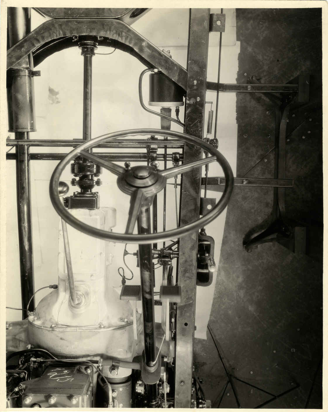 Overhead view of the chassis and steering post for a 1932 Packard Eight car. Handwritten on back: "1932 Packard Eight, Ninth series, Model 902. 8 cy., 110 b.h.p., 136 1/2" whb. Chassis. Prototype. Detail: Steering post. Note: Two-piece drive shaft. Conventional foot pedals. '1215' in white chalk on rear of engine block. Automatic clutch mechanism & control. Mechanical, folder #1."