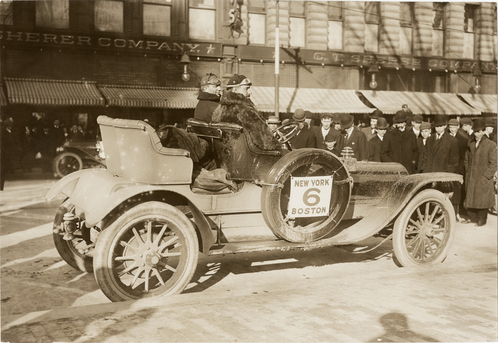 Motorists posing in Franklin automobile, Worcester, Massachusetts, 1909 New York to Boston Endurance Run