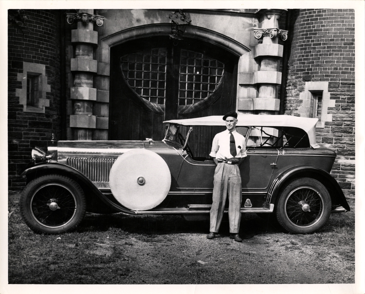 View of a man posing with a 1924 Isotta-Fraschini torpedo touring car. Handwritten on back: "Isotta, torp. tour, 1924."