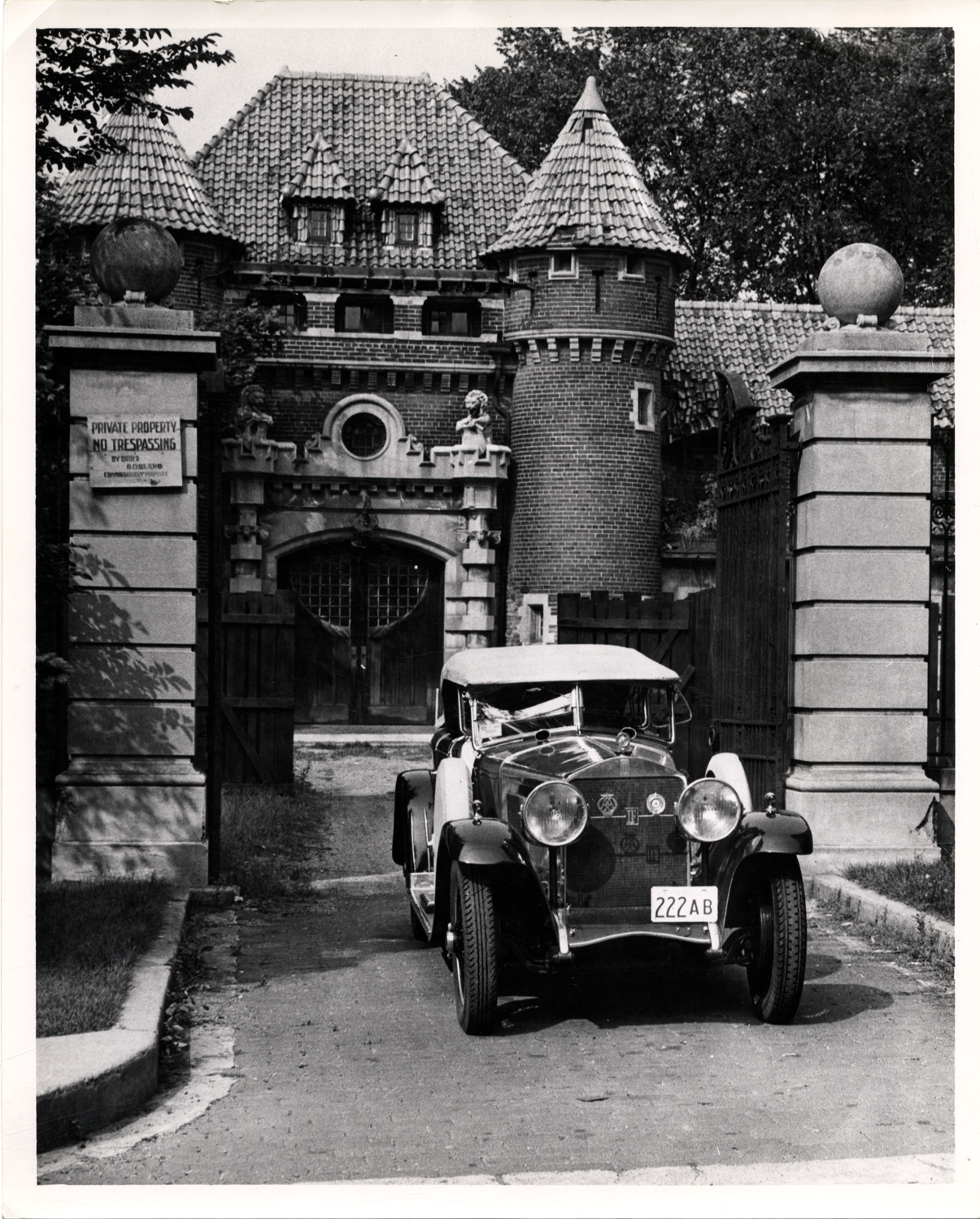 View of a 1924 Isotta-Fraschini car. Stone and brick house with turrets in background. Sign on stone gate reads: "Private property, no trespassing." Handwritten on back: "Isotta, torp. tour, 1924."