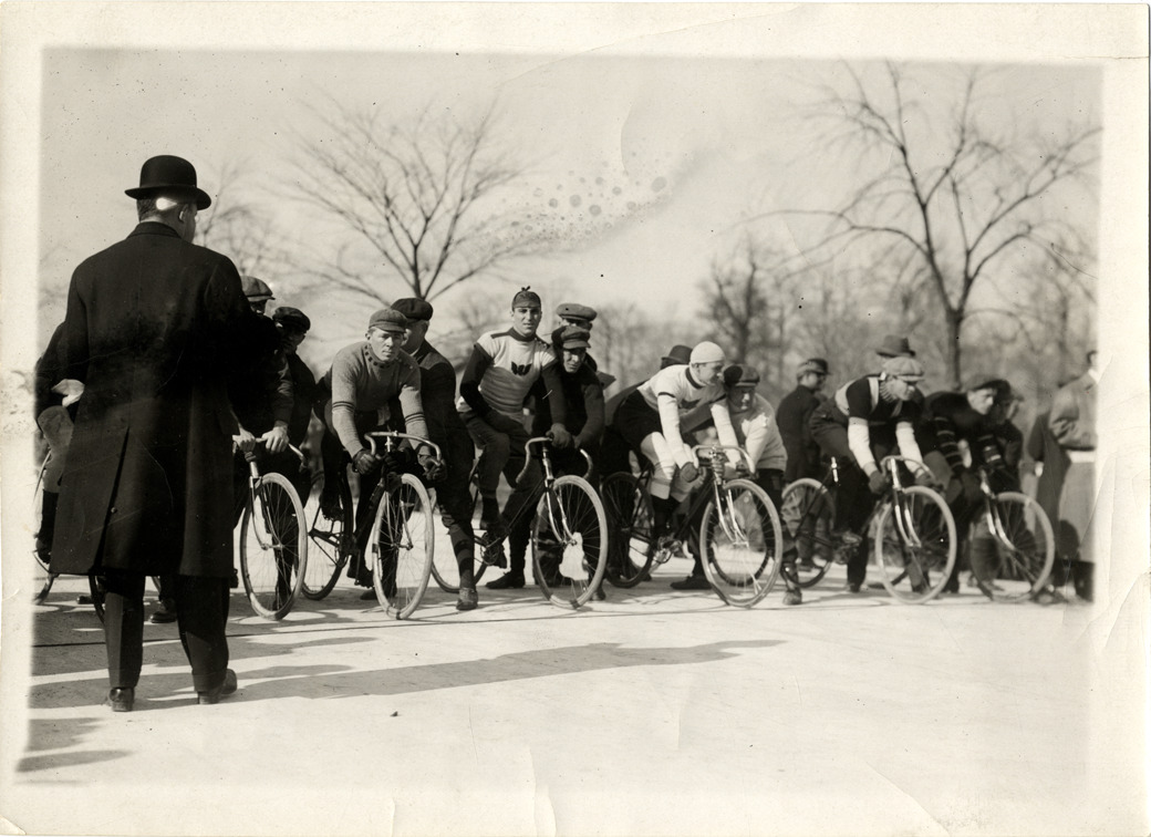 Favorite this☆ Men at start of bicycle race Description: View of a group of men on bicycles, at the start of a bicycle race. Stamped on back: "Spooner & Wells, Inc., photographers, telephones 3472-3473 Columbus, 1931 Broadway, New York." Handwritten on back: "Bicycle racing." Details Resource ID: na042802 Creator: Spooner & Wells Subject: Bicycles Cyclists Bicycle racing Photographers--New York (State)--New York Photographic prints Date Issued: Unknown year Format: 1 photographic print ; 5 x 7 in. Member of: National Automotive History Collection Lazarnick Collection Filing Location: General photograph files, Bicycle racing Rights: Physical rights are retained by DPL. Copyright is retained in accordance with U.S. copyright laws.