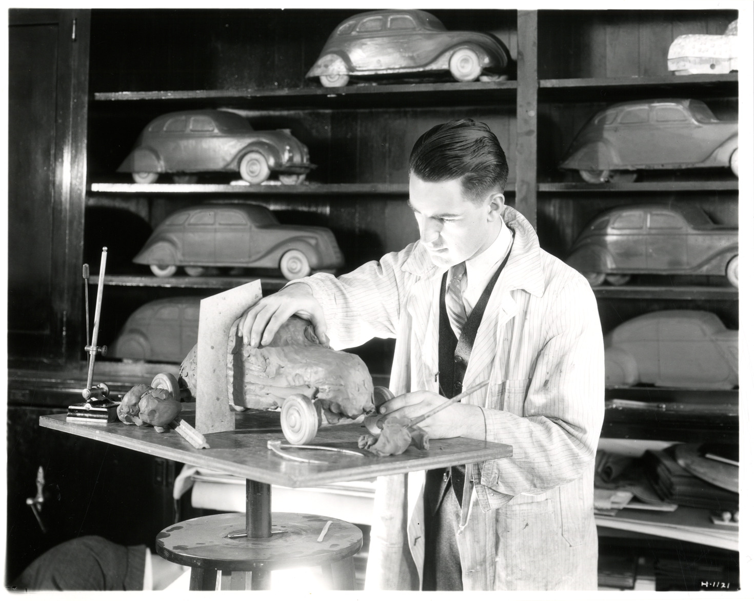 Favorite this☆ Clay modeler working on model of 1934 Chrysler automobile Description: View of modeler working on clay model of of 1934 Chrysler car. Additional models are displayed on shelves in background. Handwritten on back: "Chrysler, 1934. Clay models." Details Resource ID: na042808 Subject: Chrysler automobile--Bodies--Design and construction Clay modeling Models (Clay, plaster, etc.) Photographic prints Date Issued: Unknown year Format: 1 photographic print ; 8 x 10 in. Member of: National Automotive History Collection Filing Location: Design--Chrysler Rights: Physical rights are retained by DPL. Copyright is retained in accordance with U.S. copyright laws.