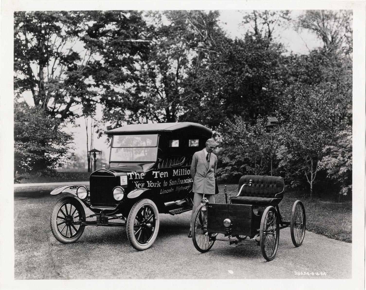 View of Henry Ford posing with his first car and the 10 millionth Model T car. Label on back: "Henry Ford, founder of the Ford Motor Company, has lived to see more than 31,000,000 Ford cars and trucks built by his company. Here he is pictured in June 1924 with the 10,000,000th Ford Model T and his first car. From Ford News Bureau. Administration Building. Dearborn, Michigan."