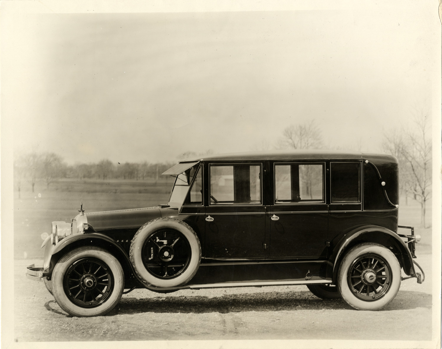 View of a 1922-1923 Cunningham limousine. Stamped on back: "The Cunningham car. Style no. 125A. Model V-4. James Cunningham Son & Co. Rochester, N.Y." Handwritten on back: "1922/3 Cunningham V4. 142" whb. Style #125A of 8.11.1922. Inside drive limousine. Similar to style 124A, the 'standard' limousine which replaced the earlier style 82-A, except that style 125A used a narrower quarter window which allowed for short leather quarters & back and dummy landau joints."