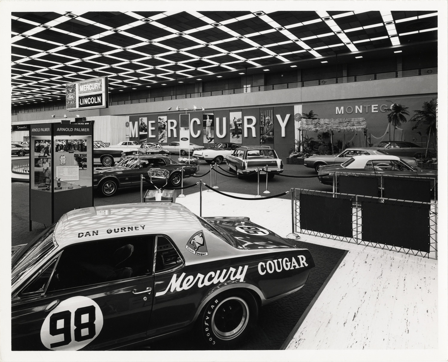 View of Mercury exhibit at the 1968 Detroit Auto Show. Dan Gurney Mercury Cougar racecar no. 98 in foreground, next to display case featuring Arnold Palmer memorabilia. "Mercury Lincoln" sign and Mercury cars on display in background. Stamped on back: "Benyas-Kaufman photographers. 8775 W. Nine Mile Rd., Oak Park, Mich. 48237. Phone (313) 548-4400." Typed on back: "52nd Annual Auto Show, Nov. 18-26, 1967."