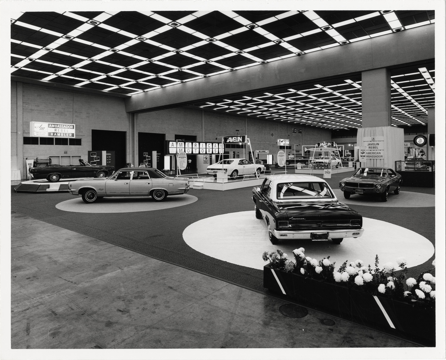 View of American Motors exhibit at the 1968 Detroit Auto Show. Ambassador, Rebel and Javelin cars displayed in exhibit. Stamped on back: "Benyas-Kaufman photographers. 8775 W. Nine Mile Rd., Oak Park, Mich. 48237. Phone (313) 548-4400." Typed on back: "52nd Annual Auto Show, Nov. 18-26, 1967."