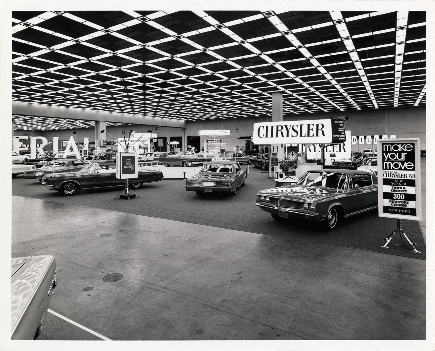View of Chrysler exhibit at the 1968 Detroit Auto Show. Chrysler cars displayed in exhibit and "Chrysler" sign in background. Stamped on back: "Benyas-Kaufman photographers. 8775 W. Nine Mile Rd., Oak Park, Mich. 48237. Phone (313) 548-4400." Typed on back: "52nd Annual Auto Show, Nov. 18-26, 1967."