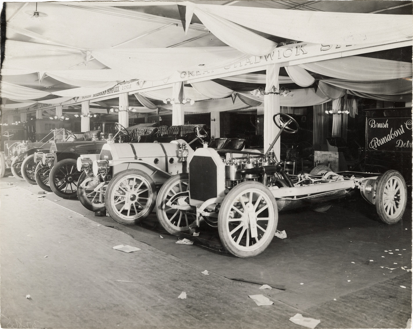 Favorite this☆ 1909 Chadwick automobiles on display at trade show Description: View of 1909 Chadwick cars on display at trade show. Stamped on back: "Spooner & Wells, Inc., photographers, telephones 3472-3473 Columbus, 1931 Broadway, New York." Details Resource ID: na042840 Creator: Spooner & Wells Subject: Automobiles Chadwick Engineering Works Trade shows Photographers--New York (State)--New York Photographic prints Date Issued: 1909 (year approximate) Format: 1 photographic print ; 7.5 x 9.5 in. Member of: National Automotive History Collection Lazarnick Collection Filing Location: General photograph files, Chadwick Rights: Physical rights are retained by DPL. Copyright is retained in accordance with U.S. copyright laws.