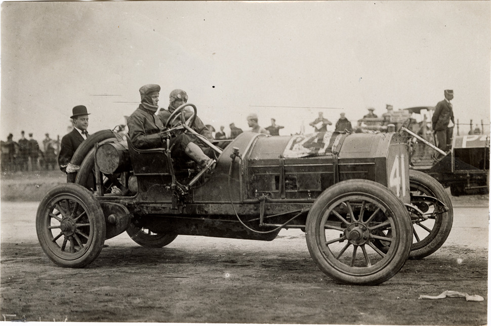 View of driver Willie Haupt and passenger in Chadwick racecar no. 41 during an unidentified race. Stamped on back: "Spooner & Wells, Inc., photographers, telephones 3472-3473 Columbus, 1931 Broadway, New York." Handwritten on back: "Haupt, dr. Chadwick, 08."