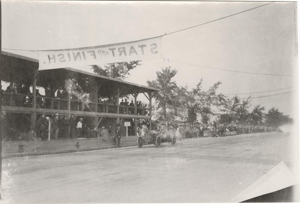 View of driver and passenger in Chadwick car no. 16 in front of grandstand during the 1909 Lowell road race in Massachusetts. "Start-Finish" banner is displayed over track. Handwritten on back: "2 engine Chadwick, Lowell, 1909."