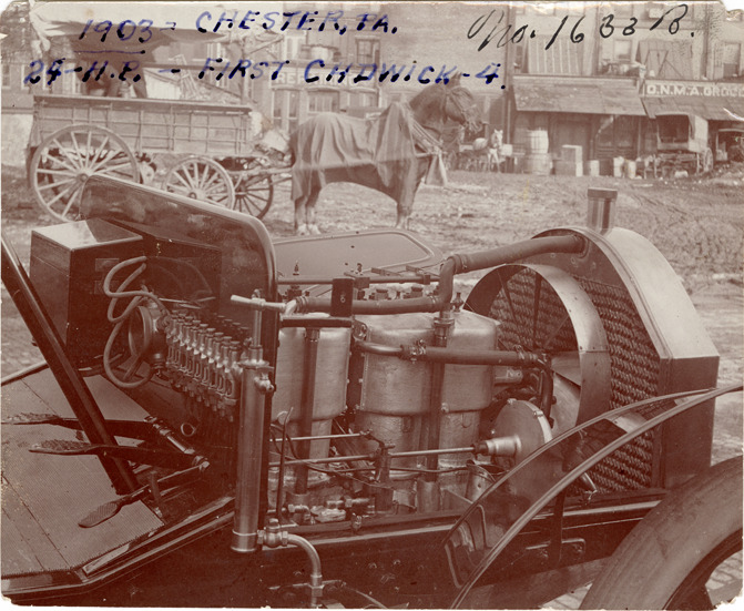 Favorite this☆ Engine, 1903 Chadwick automobile Description: View of a 1903 Chadwick car engine. Horse-drawn wagon in background. Handwritten on front: "1903, 24 h.p., first Chdwick 4. Chester, Pa." Details Resource ID: na042881 Subject: Automobiles--Motors Chadwick Engineering Works Horse-drawn vehicles Photographic prints Date Issued: Unknown year Format: 1 photographic print ; 3.75 x 4.5 in. Member of: National Automotive History Collection Filing Location: Chadwick Rights: Physical rights are retained by DPL. Copyright is retained in accordance with U.S. copyright laws.