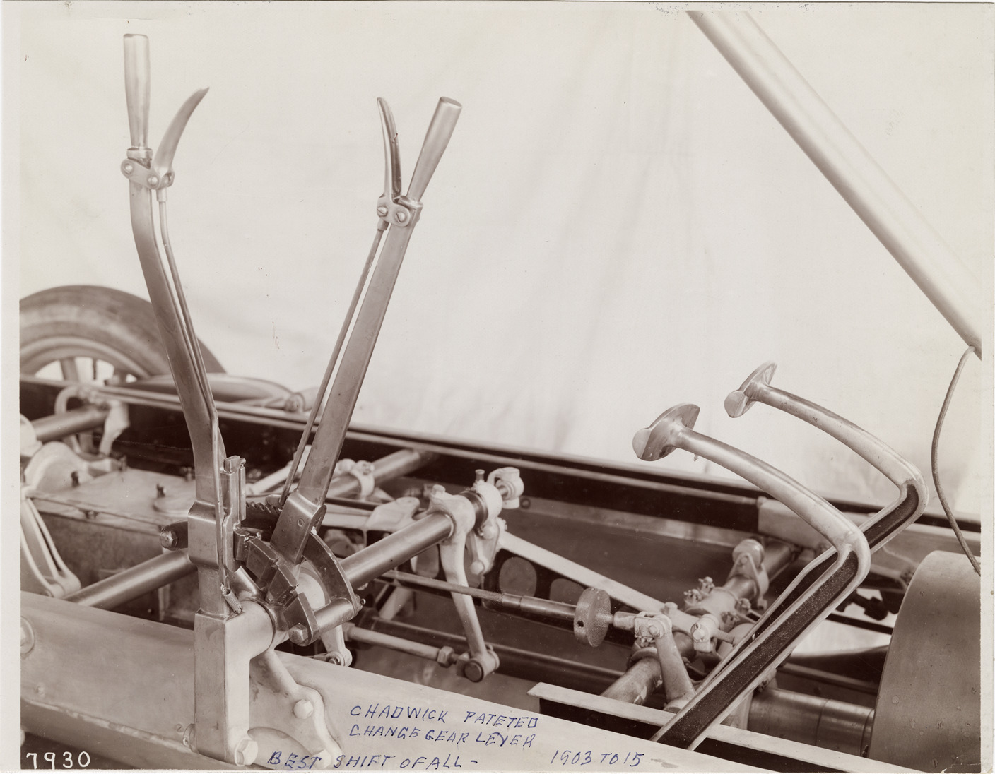 Favorite this☆ Gear lever, Chadwick automobile Description: View of a gear lever for a Chadwick car. Handwritten on front: "Chadwick pateted [sic] change gear lever. Best shift of all. 1903 to 15." Handwritten on back: "Chadwick." Details Resource ID: na042897 Subject: Automobiles--Transmission devices Chadwick Engineering Works Photographic prints Date Issued: Unknown year Format: 1 photographic print mounted on fabric ; 7.25 x 9.5 in. Member of: National Automotive History Collection Filing Location: Chadwick Rights: Physical rights are retained by DPL. Copyright is retained in accordance with U.S. copyright laws.