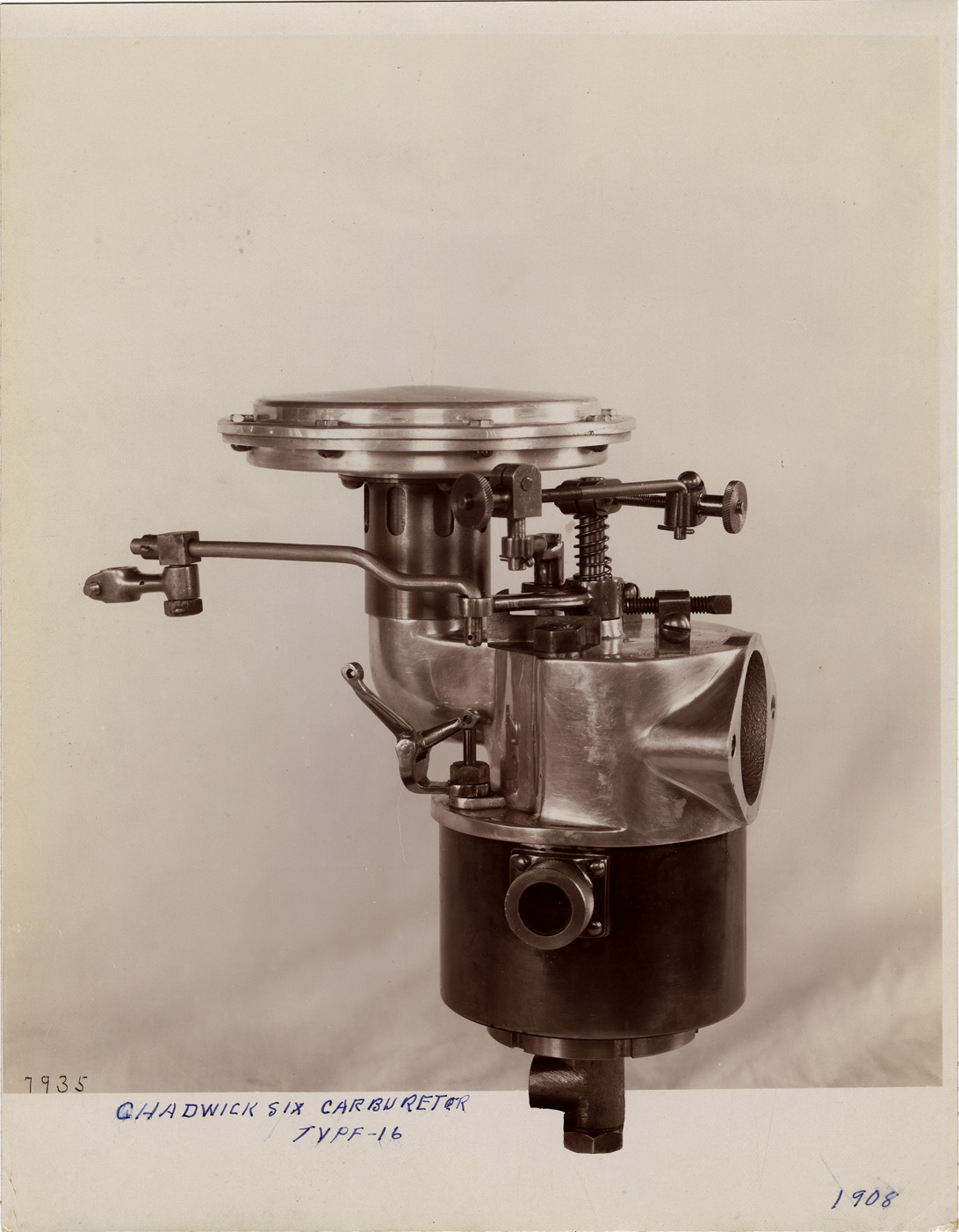 Favorite this☆ Carburetor, 1908 Chadwick Six automobile Description: View of a carburetor for a 1908 Chadwick Six car. Handwritten on front: "Chadwick Six carbureter [sic]. Type 16, 1908." Handwritten on back: "Chadwick." Details Resource ID: na042902 Subject: Automobiles--Carburetors Chadwick Engineering Works Photographic prints Date Issued: Unknown year Format: 1 photographic print mounted on fabric ; 9.25 x 7.25 in. Member of: National Automotive History Collection Filing Location: Chadwick Rights: Physical rights are retained by DPL. Copyright is retained in accordance with U.S. copyright laws.