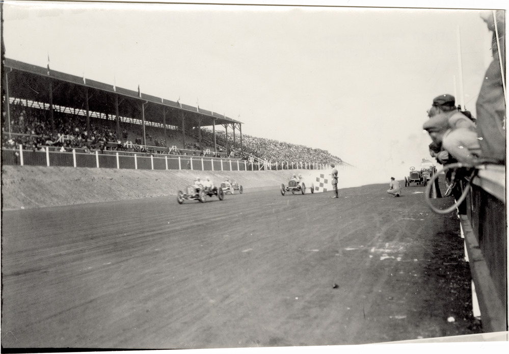 View of Bert Dingley in Chalmers-Detroit car no. 19 and Billy Knipper in Chalmers-Detroit car no. 17 at Atlanta Speedway in Georgia. Grandstand and spectators in background. Handwritten on back: "19, Dingley, Chalmers-Detroit; 17, Knipper, Chalmers-Detroit. Atlanta, 1909."