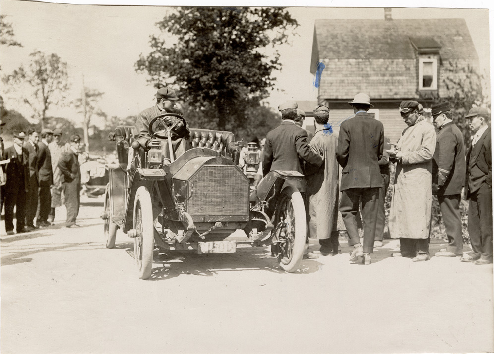 View of driver in Chalmers-Detroit car during an unidentified competition. Official stand on right. Stamped on back: "Spooner & Wells, Inc., photographers, telephones 3472-3473 Columbus, 1931 Broadway, New York." Handwritten on back: "Chalmers, ca. 09."