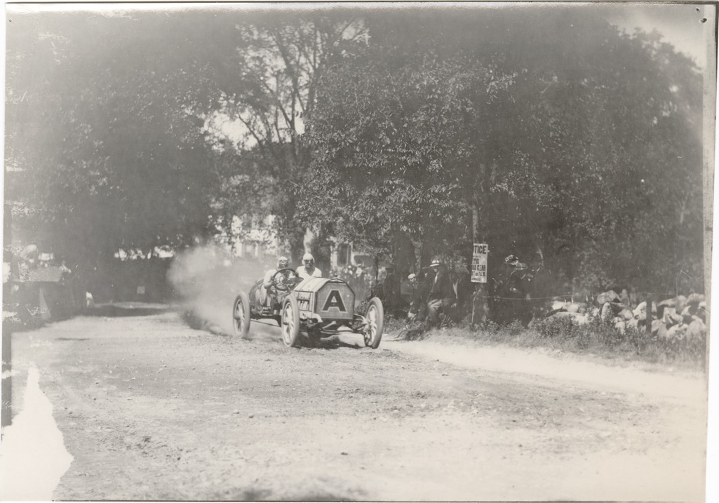View of L.B. Lorimer and passenger racing Chalmers-Detroit car no. A on rural dirt road during the 1909 Lowell road race in Massachusetts. Handwritten on back: "Lorrimer [sic], Chalmers, Lowell, 1909."