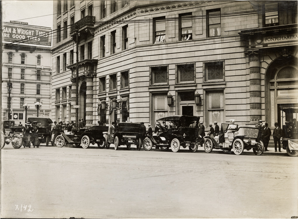 Favorite this☆ 1910 Chalmers automobiles in street Description: View of 1910 Chalmers cars in street, in front of the Hotel Pontchartrain in Detroit, Michigan. Handwritten on back: "Chalmers, 1910. Chalmers 30." Details Resource ID: na042934 Subject: Automobiles--Michigan--Detroit Chalmers Motor Company Hotels--Michigan--Detroit Photographic prints Date Issued: Unknown year Format: 1 photographic print ; 5 x 7 in. Member of: National Automotive History Collection Lazarnick Collection Filing Location: General photograph files, Chalmers, 1910 Rights: Physical rights are retained by DPL. Copyright is retained in accordance with U.S. copyright laws.