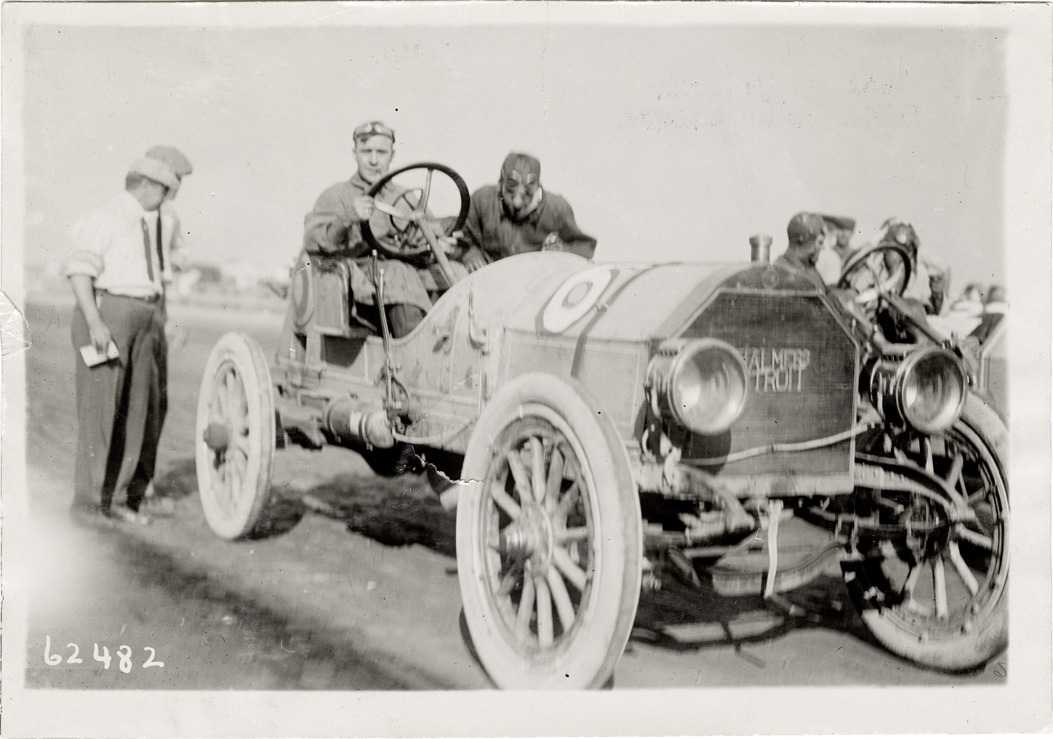 View of Charles Howard posing in Chalmers-Detroit car no. 6 at the Point Breeze track. Stamped on back: "Spooner & Wells, Inc., photographers, telephones 3472-3473 Columbus, 1931 Broadway, New York." Handwritten on back: "Howard, Chalmers. Pt. Breeze. Chalmers, ca.1910."