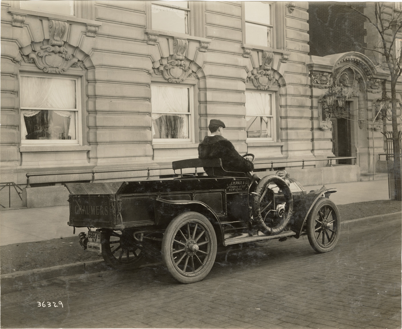 View of a man posing in a 1910 Chalmers car. "Carl H. Page & Co., Broadway at 50th, New York" is painted on side of car. Stamped on back: "Spooner & Wells, Inc., photographers, telephones 3472-3473 Columbus, 1931 Broadway, New York." Handwritten on back: "Chalmers, 1910."