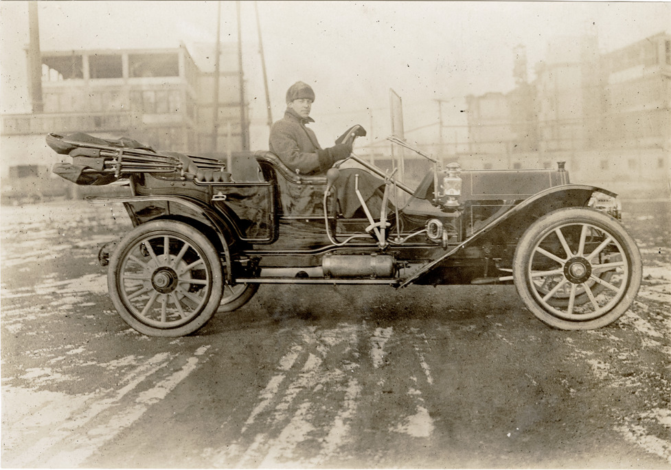 Driver posing in Chalmers automobile