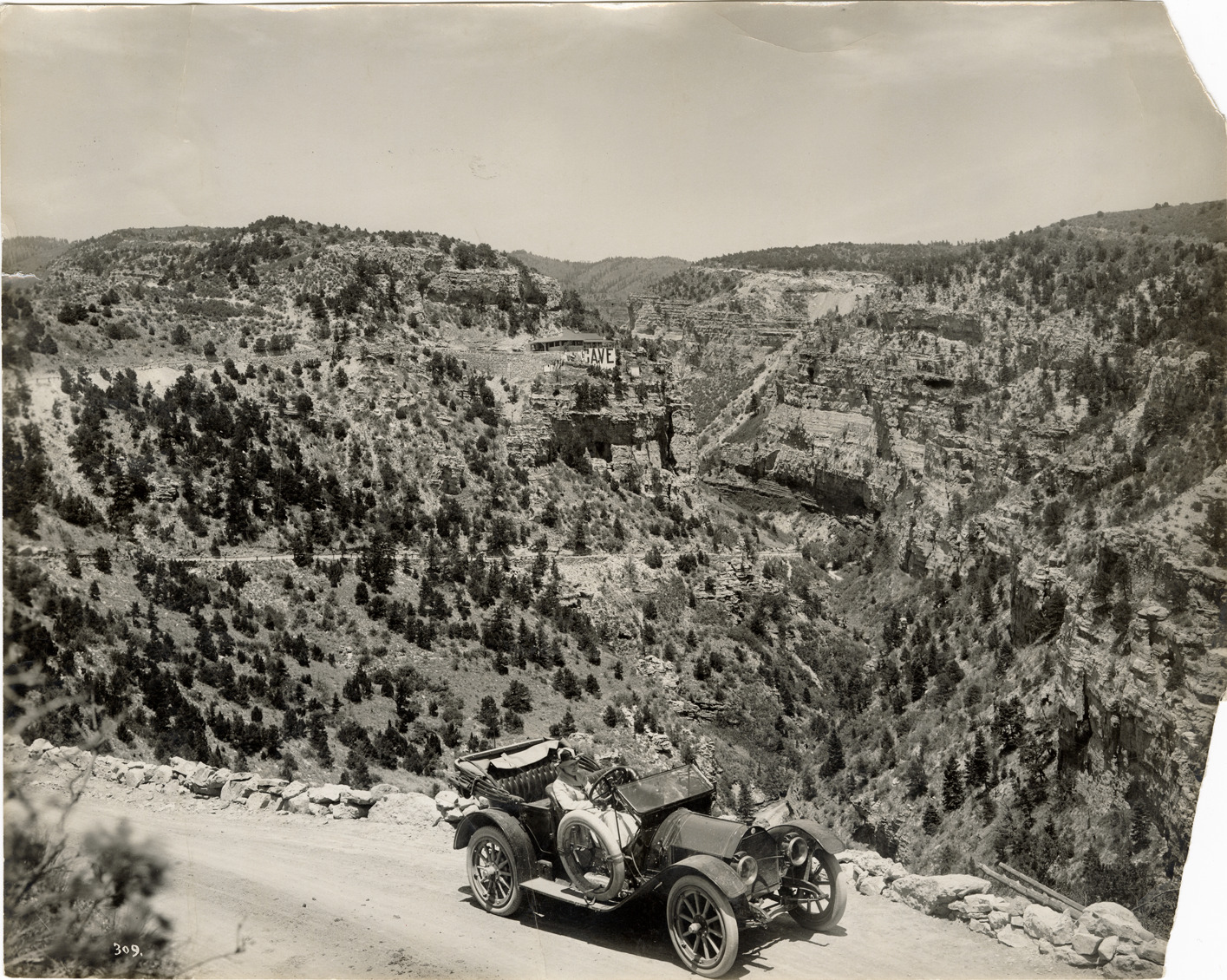View of motorist posing at the edge of Williams Canyon near Manitou, Colorado. Cave of the Winds in background. Label on back: "Williams Canon and the Cave of the Winds, near Manitou, Colo. Williams Canon is one of the rugged and picturesque canons of the Pikes Peak region. Its entrance is just north of the Soda Springs, Manitou. The prevailing formation is the castellated limestone wall, in contrast to the granite characteristic of the other canons of that locality. The road, rising from the bottom of the canon, winds across the face of the cliff to the Cave of the Winds, itself one of the geological miracles of Colorado, with its rare crystallized formations. The return trip is over a new automobile road along the rim of Williams Canon, descending Agate Mountain by a series of loops, into Ute Pass and Manitou." Handwritten on back: "Chalmers, ca. 1910."