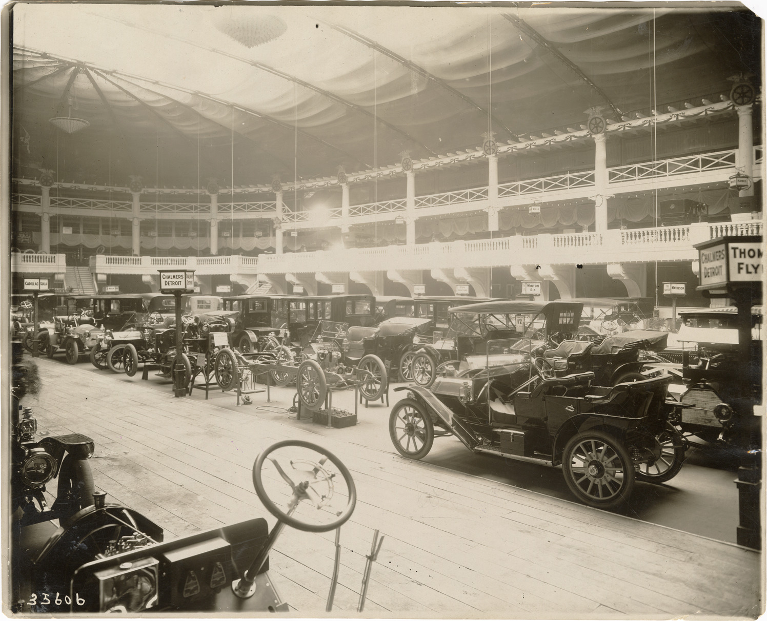 View of Chalmers-Detroit cars and chassis on display at trade show. "Chalmers-Detroit" sign in background. Stamped on back: "Lazarnick, photographic illustrations, 230 Park Avenue, New York Central Building, New York City, Tel. Vanderbilt 3-0011-2-3-4." Handwritten on back: "Chalmers, 1910."