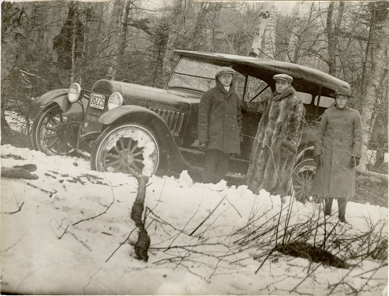 View of three men posing with a Chalmers car on snow-covered forest road at Franconia Notch, New Hampshire. Label on back: "2. In Franconia Notch, N.H. between the Flume and the Profile House." Handwritten on back: "In Franconia Notch, N.H. between the Flume and the Profile House. Chalmers, ca. 1918."