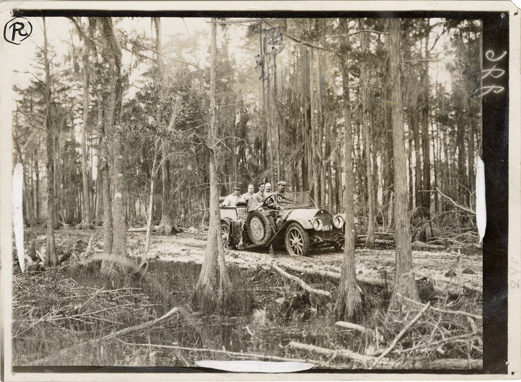 View of motorists in Chalmers automobile driving through pine forest, Florida. Stamped on back: "N. Lazarnick, 244-6-8 W. 42nd St., New York. Tel. 594 Bryant. In ordering duplicates mention number on back of this print. Detroit branch, 870 Woodward Av." Handwritten on back: "Motoring through Florida woods. Chalmers, ca. 1911."