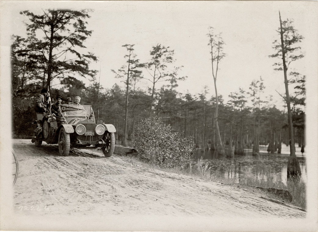 View of motorists in Chalmers car on rural dirt road during the 1911 Good Roads Tour sponsored by the Touring Club of America. The tour covered a route from Atlanta, Georgia to Richmond, Virginia. Stamped on back: "Spooner & Wells, Inc., photographers, telephones 3472-3473 Columbus, 1931 Broadway, New York." Handwritten on back: "Chalmers, ca. 1911."