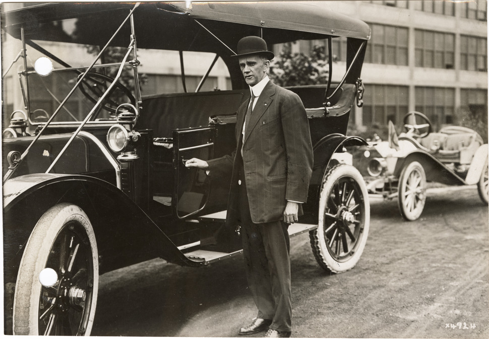 Agent posing with Chalmers automobile, Chalmers Motor Company factory