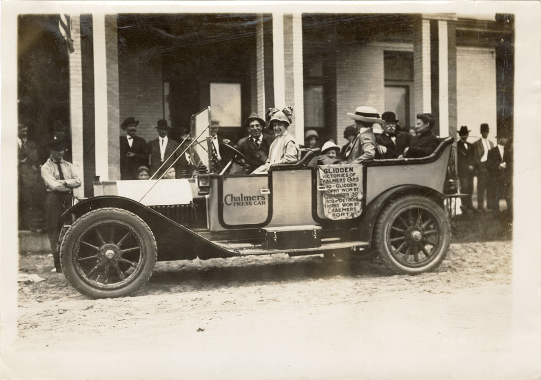 View of motorists posing in 1912 Chalmers press car. "Chalmers press car" is painted on driver's door. Sign on car reads: "Glidden victories of Chalmers cars. No Glidden trophy won by Chalmers 30. Detroit trophy won by Chalmers Forty." Stamped on back: "Spooner & Wells, Inc., photographers, telephones 3472-3473 Columbus, 1931 Broadway, New York." Handwritten on back: "Chalmers, 1912."