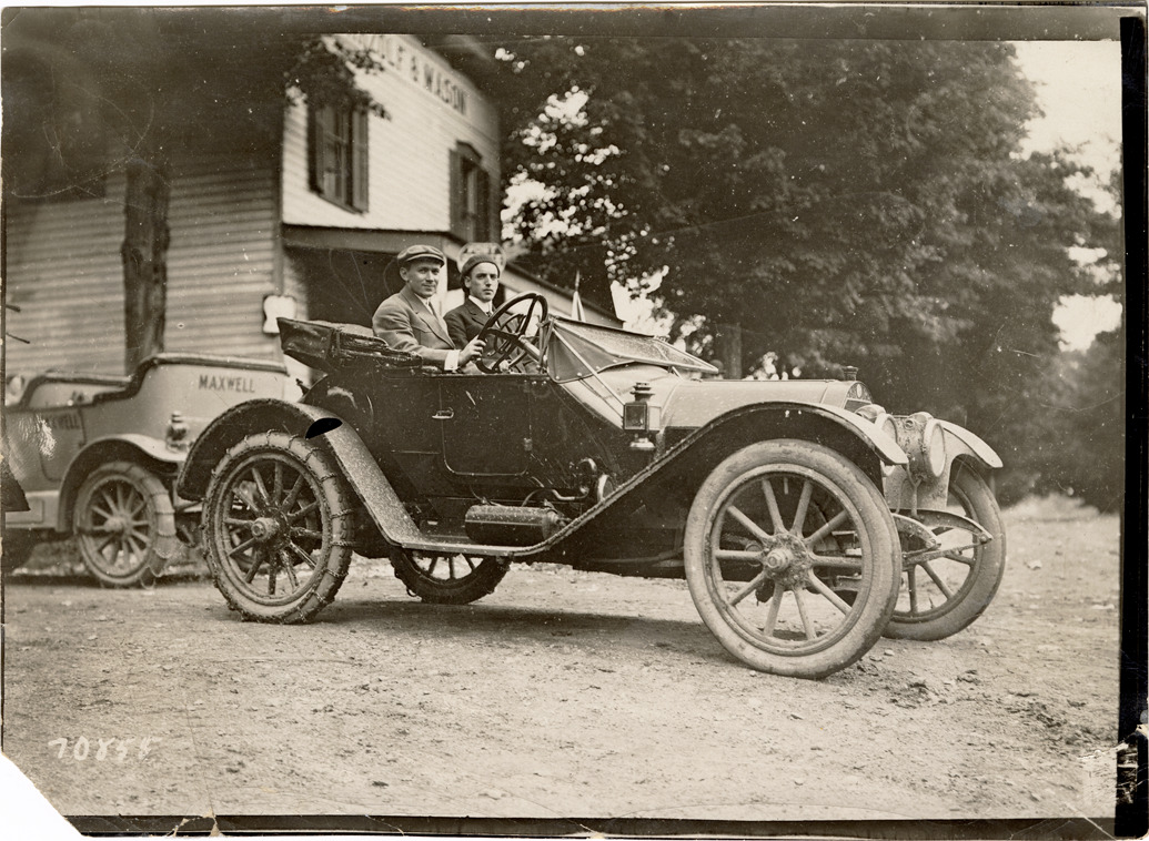 View of motorists posing in a 1912 Chalmers car. Wooden-frame building and Maxwell car in background. Stamped on back: "Spooner & Wells, Inc., photographers, telephones 3472-3473 Columbus, 1931 Broadway, New York." Handwritten on back: "Chalmers, 1912."