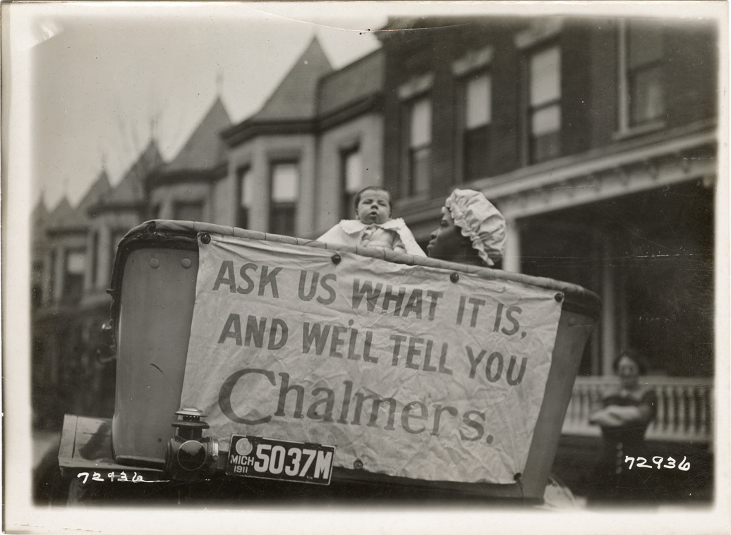 View of a woman, wearing a cap and apron, posing with an infant in the back of a Chalmers car. Sign on car reads: "Ask us what it is and we'll tell you. Chalmers." Stamped on back: "Spooner & Wells, Inc., photographers, telephones 3472-3473 Columbus, 1931 Broadway, New York." Handwritten on back: "Chalmers, ca. 1912."