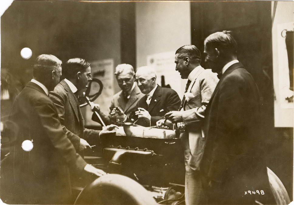 Favorite this☆ Men examining Chalmers automobile at sales convention Description: View of several men looking at a Chalmers car during Chalmers Motor Company sales convention. Handwritten on back: "Convention at Chalmers Motor Co. Chalmers, ca. 1915." Details Resource ID: na043029 Subject: Automobiles--Michigan--Detroit Congresses and conventions--Michigan--Detroit Sales meetings--Michigan--Detroit Chalmers Motor Company Photographic prints Date Issued: 1915-11 Format: 1 photographic print ; 4.5 x 6.5 in. Member of: National Automotive History Collection Lazarnick Collection Filing Location: General photograph files, Chalmers, 1915 Rights: Physical rights are retained by DPL. Copyright is retained in accordance with U.S. copyright laws.