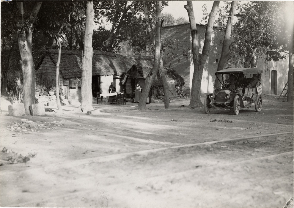 View of Chalmers-Detroit "30" pathfinder car parked in front several dwellings in Mexico during the Flag-to-Flag Endurance Run from Denver to Mexico City. Handwritten on back: "Chalmers, Flag to Flag Tour, 1909."