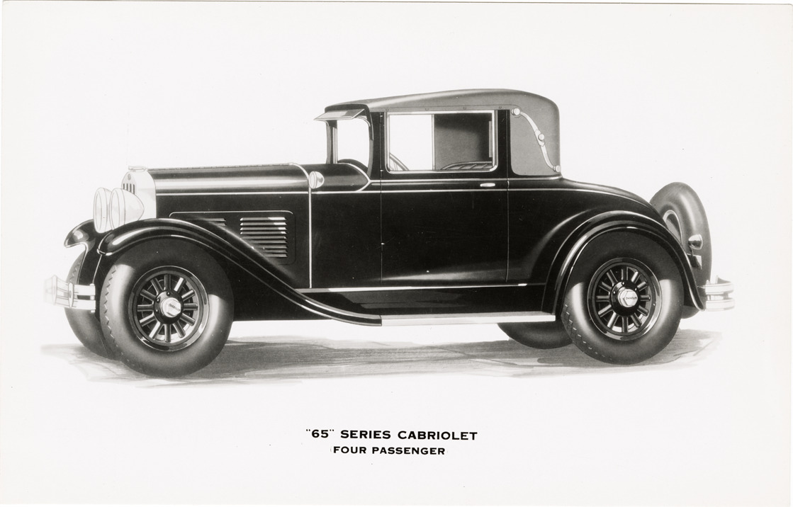 Artist's depiction of a 1929 Chandler "65" Series cabriolet. Printed on front: "'65' Series cabriolet, four passenger." Handwritten on back: "Chandler, 1929."