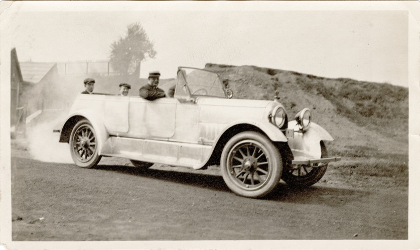 View of motorists in a 1916 Charter Oak car. Handwritten on back: "The Charter Oak designed in Hartford, Conn. in 1916 for the Eastern Motors Syndicate by F.A. Law. Built by Eastern Motors Incorporated in New Britain, Conn. in 1916 and 17. The first World War closed them up for want of capital. Body is equipped with a disappearing top designed by Law, built by Mercer in East Hartford."