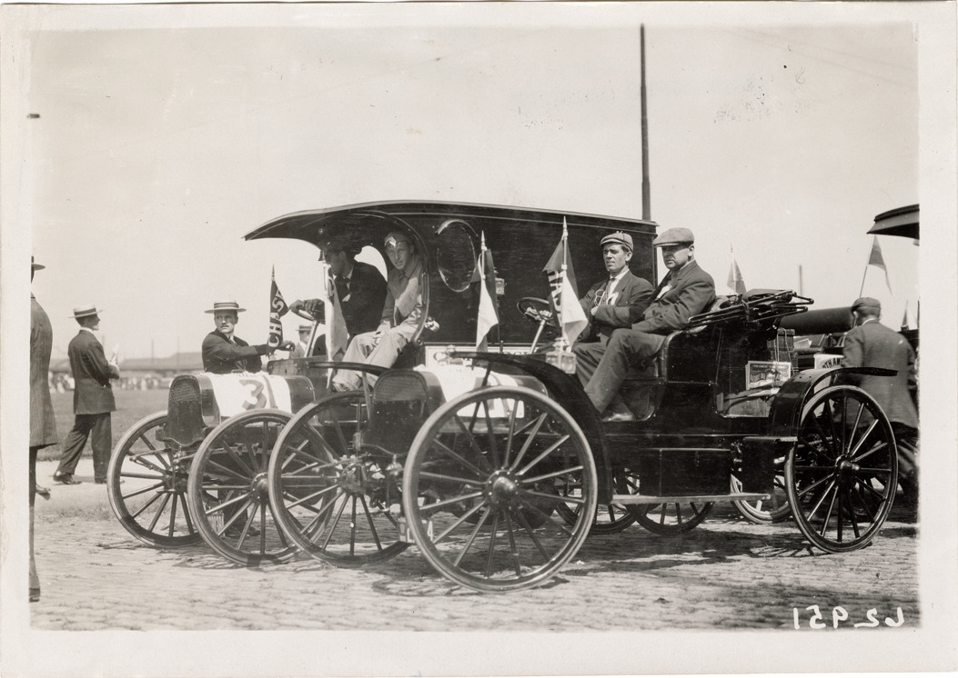 View of motorists in Chase car no. 4 and truck no. 3 at an unidentified event. Stamped on back: "Spooner & Wells, Inc., photographers, telephones 3472-3473 Columbus, 1931 Broadway, New York." Handwritten on back; "Chase, ca. 1910."