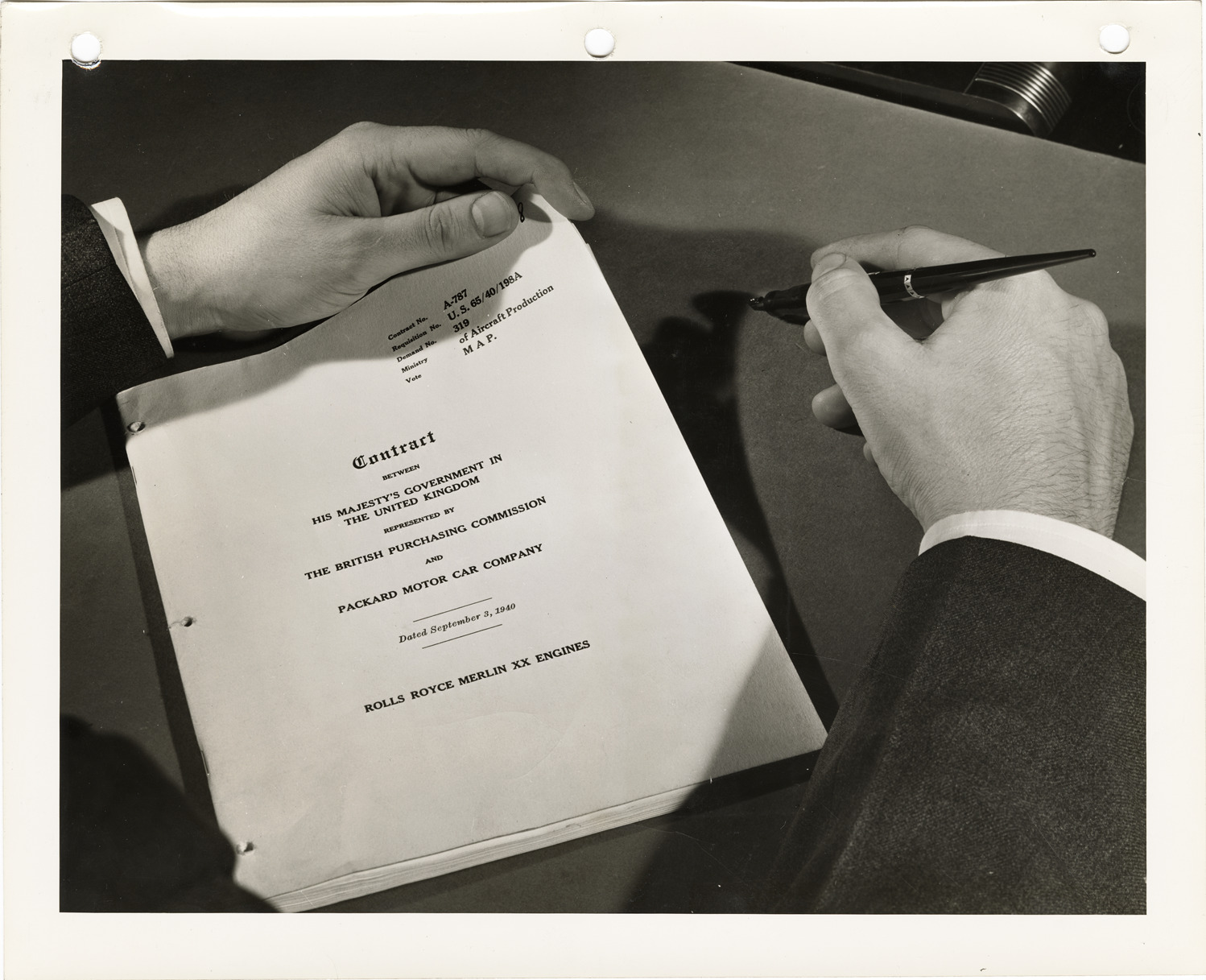 Close-up view of a man signing contract between the British government and the Packard Motor Car Company to build Rolls-Royce Merlin XX engines. Label on back: "On September 3, 1940, His Majesty's Government in the United Kingdom entered into a contract with the Packard Motor Car Company, of Detroit, Michigan. With time the essence, this contract called for the creation of a facility, the organization of personnel and coordination of the whole to the earliest possible production of a quantity of Rolls-Royce Merlin XX fighter engines for the Royal Air Force of Great Britain."