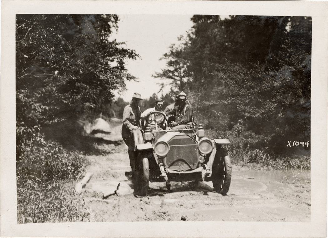 View of motorists traveling in Cino car on rural dirt road. Stamped on back: "Spooner & Wells, Inc., photographers, telephone North 1745. 1231 Woodward Ave., Detroit, Mich. Detroit, 1231 Woodward, New York, 1931 Broadway." Handwritten on back: "Cino, ca. 1910."