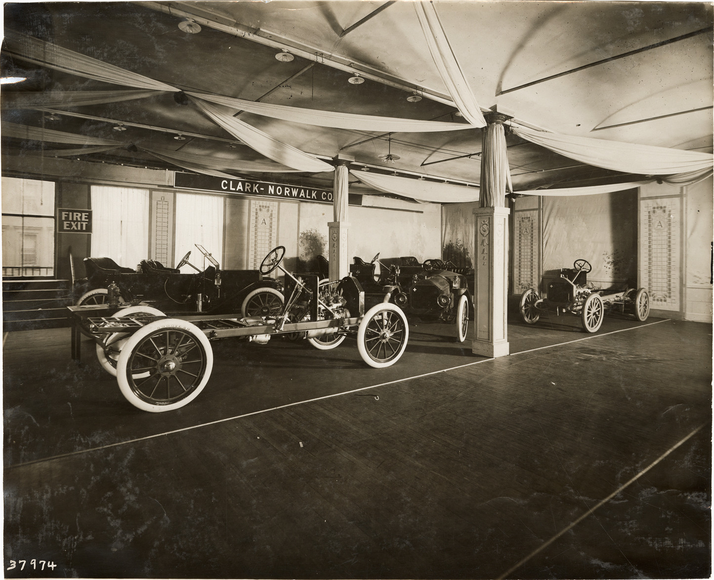 Favorite this☆ 1911 Clark automobiles on display in trade show Description: View of 1911 Clark cars and chassis on display in trade show. Stamped on back: "Spooner & Wells, Inc., photographers, telephones 3472-3473 Columbus, 1931 Broadway, New York." Handwritten on back: "Clark, 1911." Details Resource ID: na043150 Creator: Spooner & Wells Subject: Automobiles Automobiles--Chassis Clark-Norwalk Company Trade shows Photographers--New York (State)--New York Photographic prints Date Issued: Unknown year Format: 1 photographic print ; 7.5 x 9.5 in. Member of: National Automotive History Collection Lazarnick Collection Filing Location: General photograph files, Clark Rights: Physical rights are retained by DPL. Copyright is retained in accordance with U.S. copyright laws.