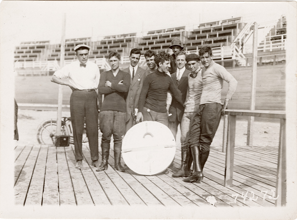 View of several motorcyclists posing at racetrack. Stamped on back: "Spooner & Wells, Inc., photographers, 1931 Broadway, N.Y. City, phones 3472-3473 Col." Handwritten on back: "Clothing, motorcyclists."