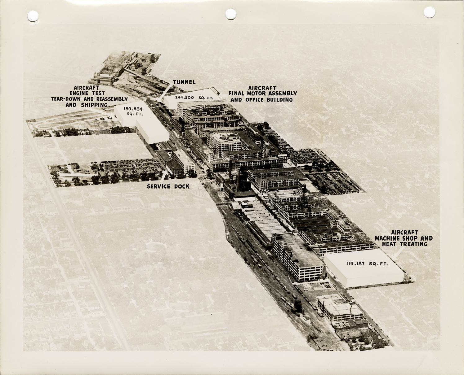Plan for a Packard factory to build Rolls-Royce Merlin XX engines. Label on back: "Objective of the Packard builders was the creation of more than a million square feet of working floor space. Three new factories were to develop 553,171 square feet of the necessary space. In the interests of time, an additional 500,000 square feet was taken from existing Packard factories through consolidation of departments and other means."