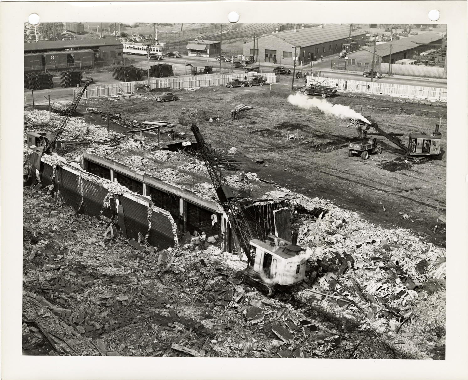 View of cranes and power shovels demolishing buildings to prepare for building main assembly plant for Packard Rolls-Royce Merlin XX engines. Label on back: "Without delay, powered shovels and wrecking cranes began the demolition of obsolete buildings for the foundations of the main assembly plant for Packard Rolls-Royce. There was ironic historical repetition in the demolition of these old structures. They were the remnants of the factories of World War One where Packard built 6,000 Liberty motors for the fighting aircraft of the United States, Great Britain and her Allies."