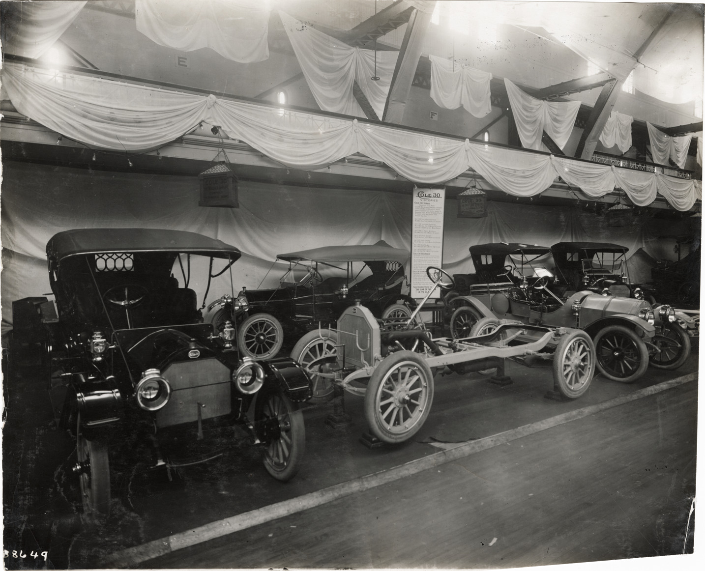 View of 1912 Cole cars and chassis on display at trade show. Stamped on back: "Spooner & Wells, Inc., photographers, telephones 3472-3473 Columbus, 1931 Broadway, New York." Handwritten on back: "Cole, 1912."