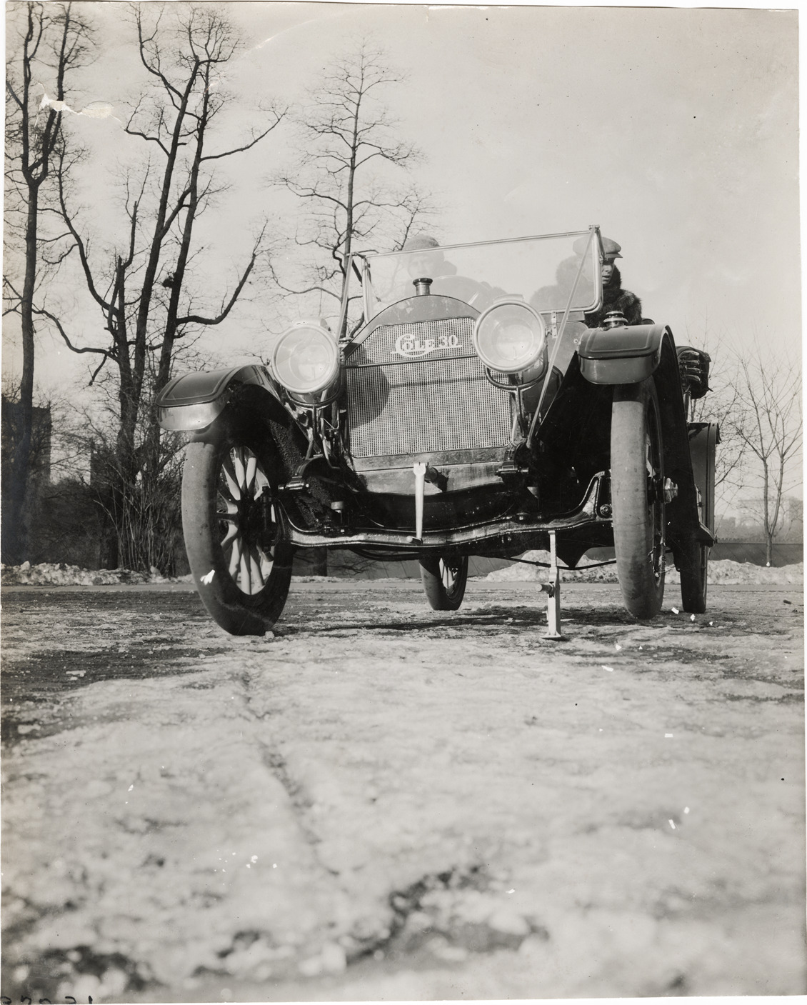 View of two men in a Cole 30 car. Tire jack holds up front end of car. Stamped on back: "Spooner & Wells, Inc., photographers, telephones 3472-3473 Columbus, 1931 Broadway, New York." Handwritten on back: "Cole, ca. 1911."