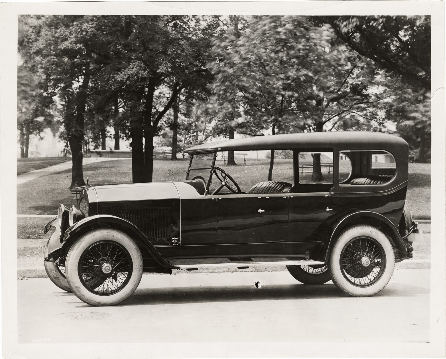 View of a 1921 Cole Aero Eight Model 870-A Tourster. Label on back: "Cole Aero Eight Model 870-A, seven passenger all season Tourster. The all-season Tourster meets fully the requirements of motorists who desire the advantages of an enclosed equipage for inclement weather without sacrificing the lightness of weight and general utility of the open car. Equipped with an improved design of permanent top of the California type. Large plate glass panels enclose the tonneau seat at the rear and sides, insuring cleanliness, comfort and cool seclusion to the tonneau passengers." Typed on back: "1921 Cole." Handwritten on back: "Cole."